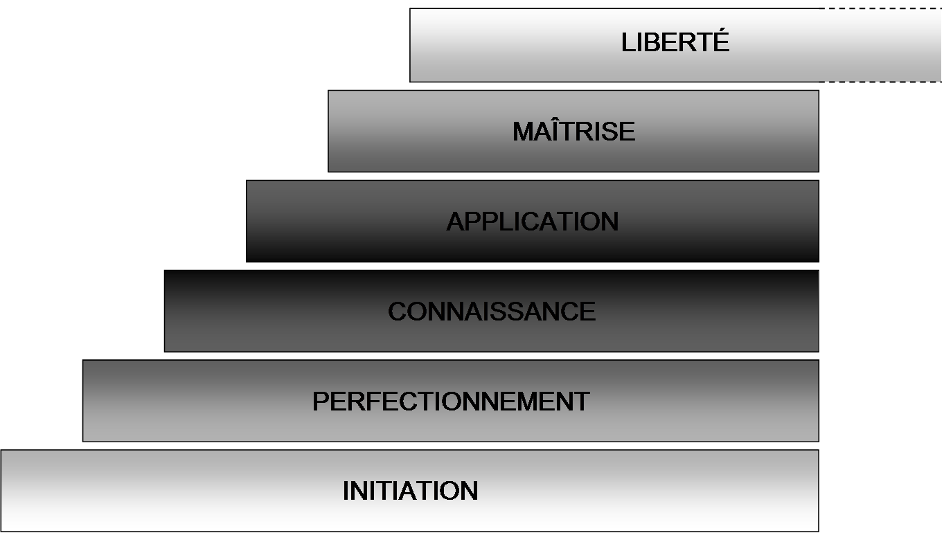 Puis à l’image des anciens systèmes de graduation japonais, cinq certifications supérieurs ont été créées afin d’échelonner la progression des ceintures noires dans le but d’atteindre le dernier niveau de pratique, celui de la liberté.